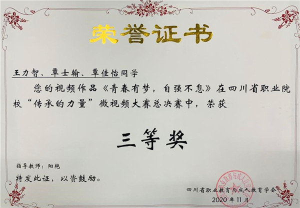 近日,第三届奋进新时代中华传统美德天府职教行活动周在成都举行。由四川航天职业技术学院(以下简称:四川航天职院)基础教学部选送的微视频《青春有梦,自强不息》荣获三等奖。这是该校基础教学部学生首次参加此类型的比赛并获奖。