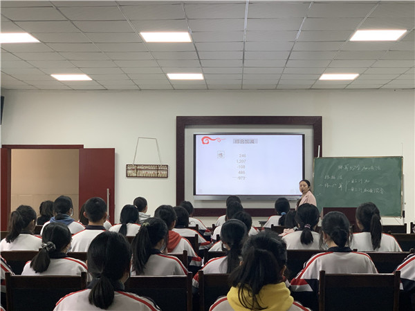 随后,在副校长程越敏、教务处副主任徐蓓和学生处副主任姚凯的带领下,来宾们走进学校“珠算能手一级”余燕老师的珠算课堂,颔首称赞了余老师与同学们精湛的指法技巧,余老师还现场与学生进行“算盘——计算机大PK”加法比赛,余老师一目三行,最终取得绝对“胜利”。