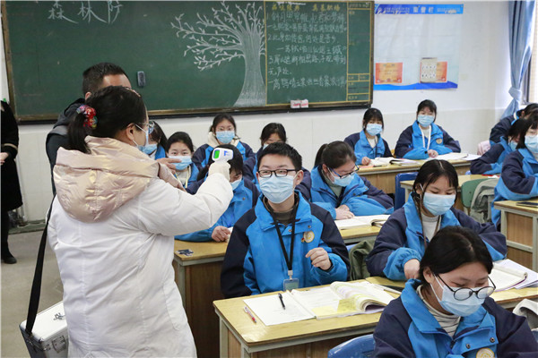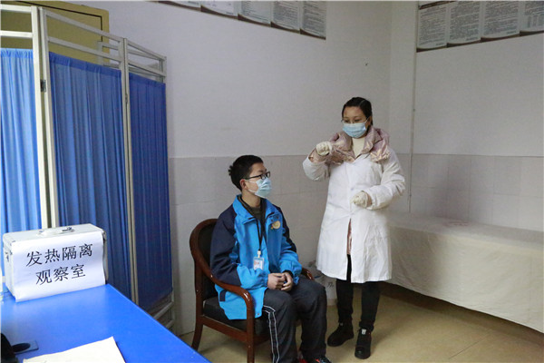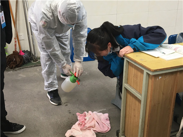 学生进校门前自觉亮出天府健康码接受检查、有序排队进行红外线体温监测、进入教室前由班主任测体温。2020级会计1班出现发热学生,任课教师曾莉第一时间上报学校疫情处理组组长,由应急处理组人员迅速将其带到留观室,交由学校保健老师检查。与此同时,安全保卫组对该班、该栋楼各楼道进行管控,并拉上警戒线,严禁人员往来,要求班级其余学生有序撤离教室。消毒组成员在做好自身防护的前提下,处理学生呕吐物,及时对教室、留观室等相关区域进行消毒处理。综合联络组向上级部门报告情况,并通知学生家长来校。事故隐患排查控制组对发生病例的区域继续隔离,等待上级部门到现场核实确认。最后,安全办安维军主任宣布演练结束。
