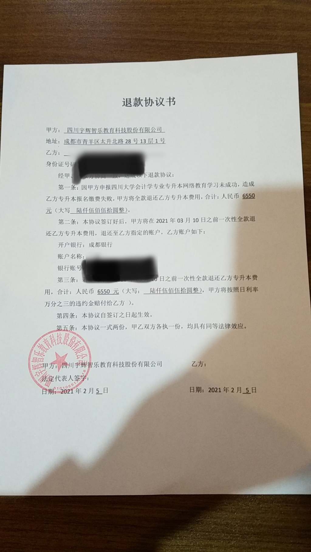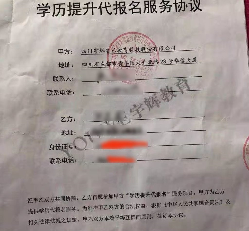 今年33岁的王女士此前在宇辉教育上过小儿推拿培训班,对这里的老师比较信任。2020年7月,抱着提升学历换个好工作的想法,她花了7350元在宇辉教育进行学历提升代报名服务,该服务包括代缴报名费、考试费、学费,办理入学手续等。之后,王女士又参加了2020年10月份的成人高考,填报了西南石油大学继续教育与网络学院的环境工程专业。可是在那之后,她再也没有得到任何有关上学的通知。