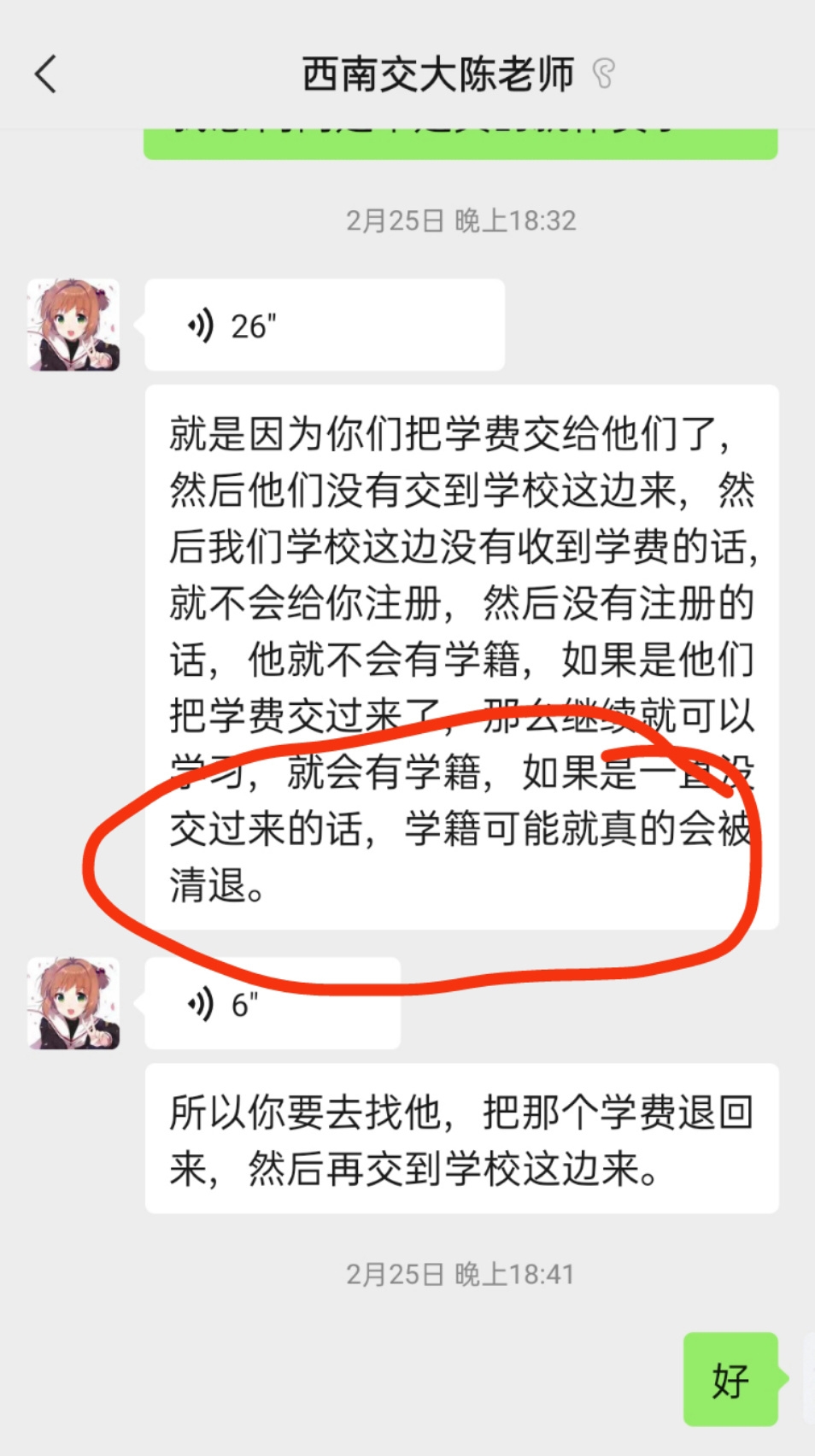 截至3月16日记者发稿前,王女士收到宇辉教育教务工作人员发来的消息,说和西南石油大学尚竞学习中心已沟通好,只要王女士先行垫付宇辉教育无法与西南石油大学结清的1500元,接下来上学的问题就可以解决了,并且会和王女士签订一份1500元的退款协议。另一名报考四川师范大学学前教育专业的学员也表示收到了一份《情况说明》,表示第一学年度的学费会由四川师范大学直属学习中心四川唐院交通职业技能培训学校垫付。