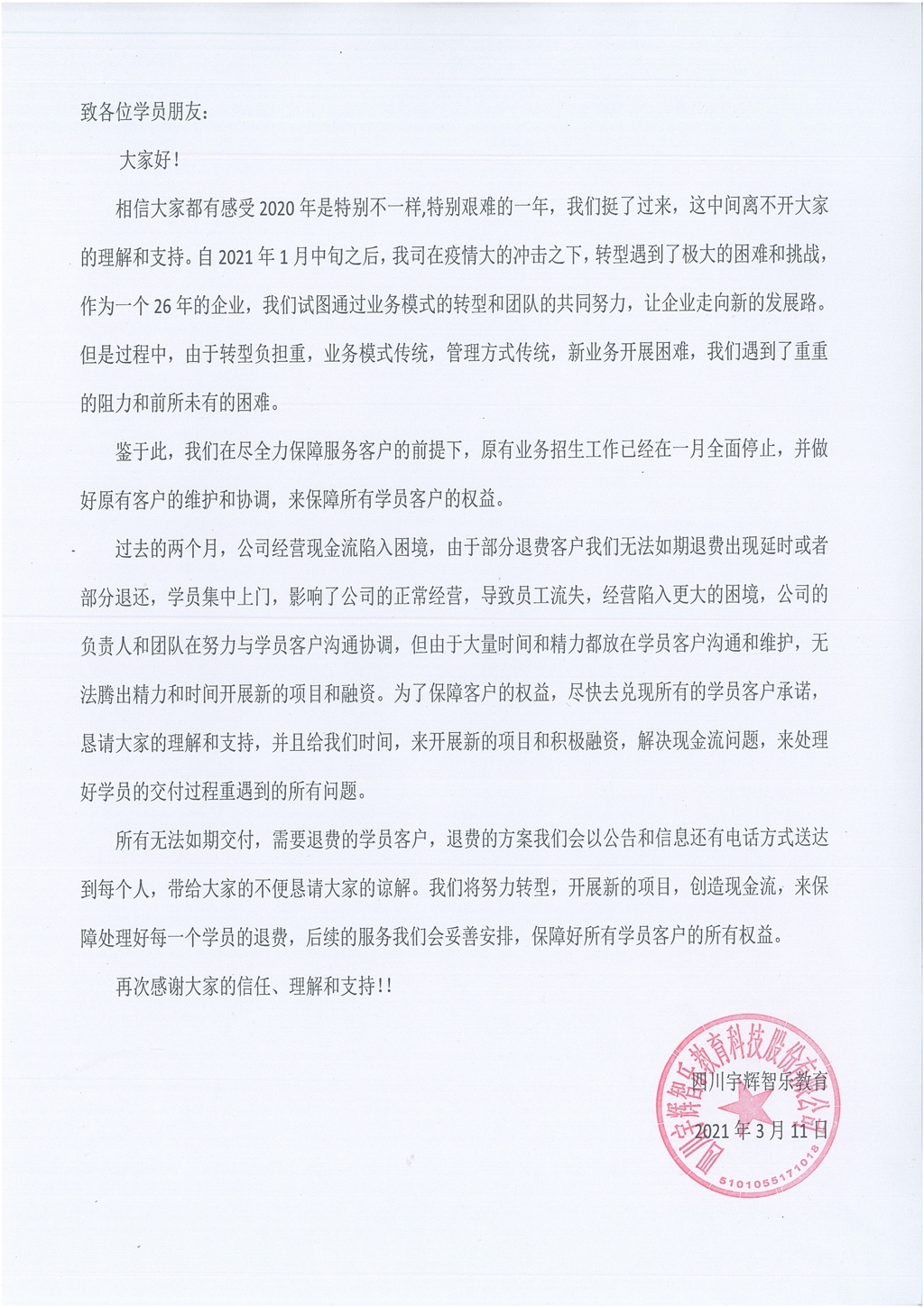 3月11日,一张加盖四川宇辉智乐教育章印《致学员》在同学之前流传,宇辉教育表示,受疫情冲击和转型困难影响,公司原有业务招生工作已经在一月全面停止,公司现金流陷入困境,希望大家给予时间,让公司开展新的项目和积极融资,来保障处理好每一个学员的退费和权益。