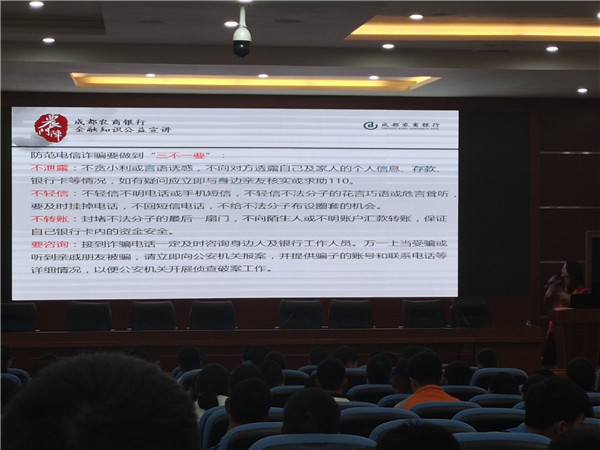 学校高度重视平安校园的和谐稳定,及时召开工作会议,安排部署相关工作任务,倡导全校师生围绕主题,积极开展教育活动,增强安全防范意识,4月1日下午,学校邀请到成都农商银行青白江支行工作人员在学术厅举行预防电信诈骗专题讲座,向师生讲解预防电信诈骗的相关知识及打击电信诈骗违法行为的重要意义。