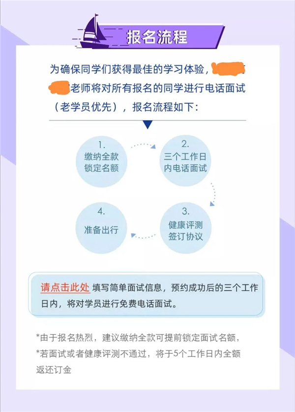 一家夏令营组织机构宣传页面上的报名流程,要求先交全款,“锁定面试名额”。(来自手机截图)