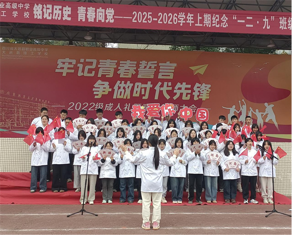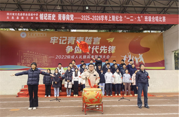 为缅怀“一二·九”运动峥嵘历史,传承红色基因,厚植青年学子爱国情怀,近日,四川省大邑县职业高级中学(以下简称:大邑职高)举办纪念“一二·九”运动班级合唱比赛。比赛分为初赛与决赛两个阶段,全校各班级踊跃参与,积极组织,用嘹亮歌声致敬革命先烈,用赤诚之心抒发家国情怀。