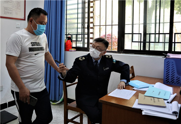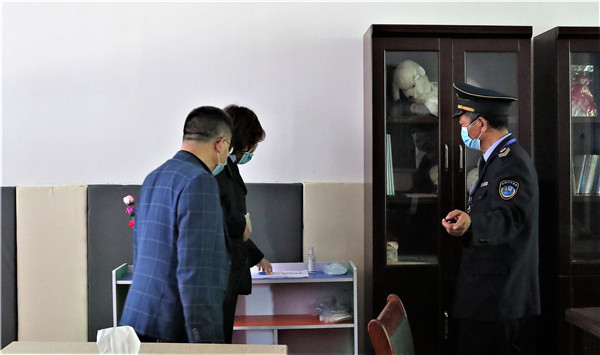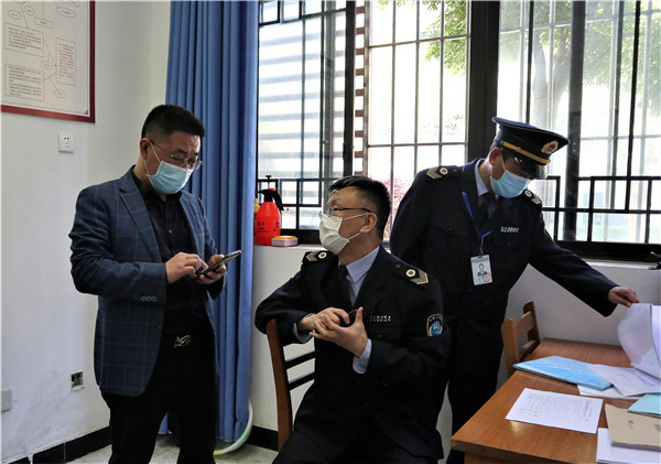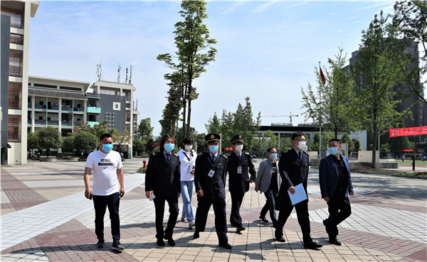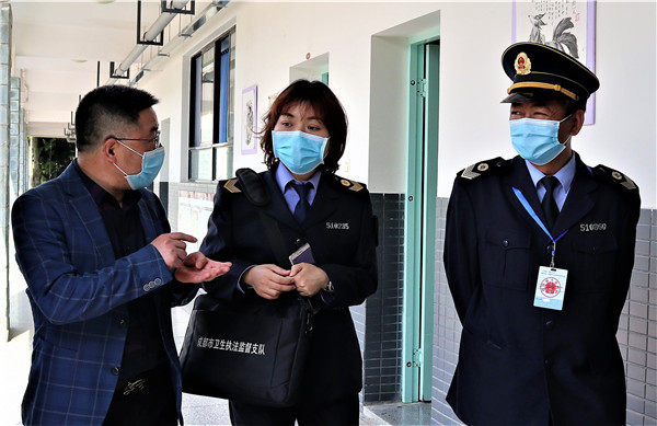 4月27日,成都市卫生执法支队学校卫生大队杨芳和钟鸣老师与郫都区卫生计生执法大队周德友副大队长和朱智中队长一行再次到岷阳实验外国语学校(以下简称“岷阳实外”)对校园防疫防控进行督查。