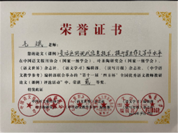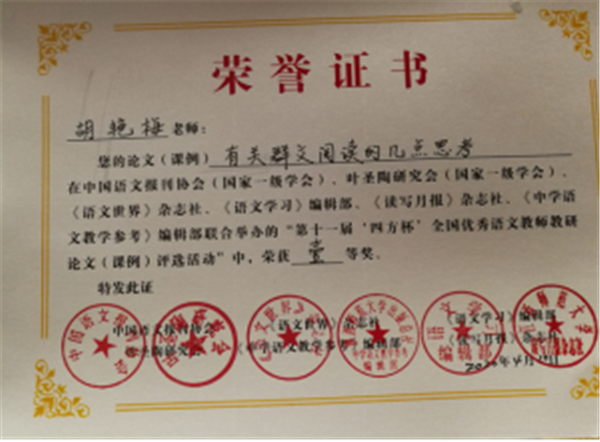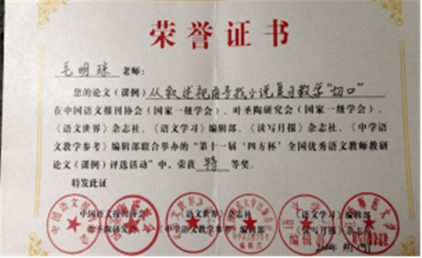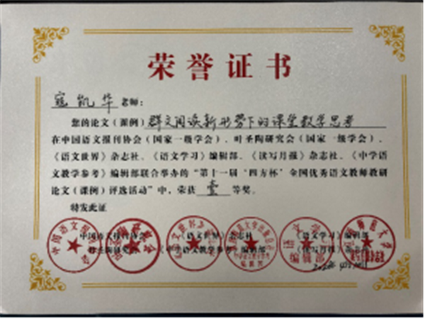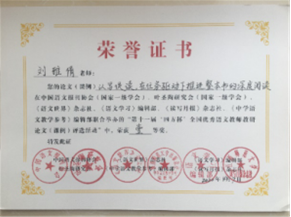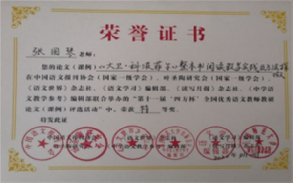 经过数月的等待,终于传来好消息!14篇参赛论文中,张国琴老师的《〈大卫·科波菲尔〉整本书阅读教学实践及方法探微》、毛明琼老师的《从叙述视角寻找小说复习教学“切口”》分别获得全国特等奖;刘雅倩老师的《以写促读,在任务驱动下推进整本书的深度阅读》、寇凯华老师的《用群文方法研究“仁”之思想》《群文阅读新形势下的课堂教学思考》、胡艳梅老师的《有关群文阅读的几点思考》分别获得全国一等奖;蒋芳老师的《敬畏语言热爱母语》、毛斌老师的《灵活运用现代信息技术,提升学生作文写作水平》分别获得全国二等奖;张煜老师的《对个性化写作的几点思考》、贾克英老师的《至性之言传至真之情》、李梦琪老师的《高中语文整本书阅读教学初探》、谢渊老师的《高中生整本书阅读导入课的思考与实践》、寇凯华老师的《高考诗歌学考结合策略研究》《窦娥和祥林嫂形象之悲剧之异同分析》分别获得全国三等奖。