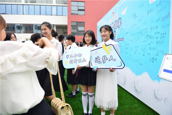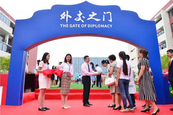 2019年9月,“外交之门”活动,全体新生与家长共同走过“外交之门”,参观我国一带一路沿线著名外交家图画展,来到签名板前签名、合影,在开学典礼上与家长交换“写给对方的信”,使学生和家长都彼此深深感动。