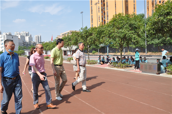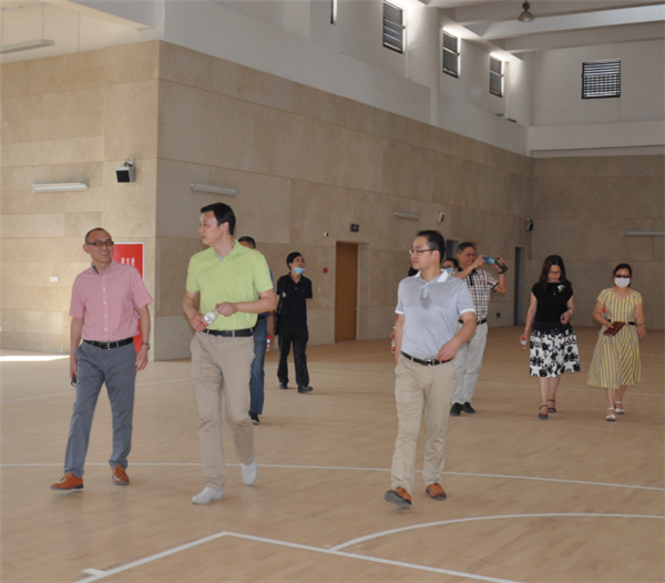 教育局党组副书记、副局长余飞(左2)查看学校体育馆