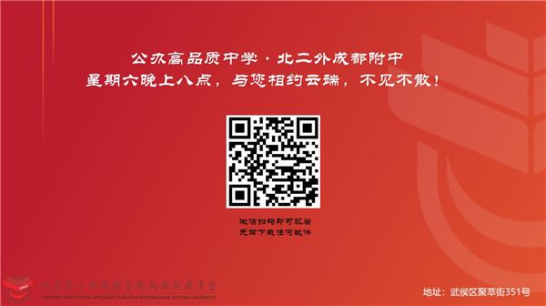 据记者了解,2020年5月23日(本周六)晚八点,北二外成都附中将“在线敞开学校大门”举行一场“云端”直播活动,如果你想走进一所充满活力的“网红”校园,见证这里的师生为“站在世界舞台,讲好中国故事”而努力,与“眼里有光、脸上有笑、心中有人”的老师沟通……那么,本次活动就是一个好机会,该校诚邀您本周六晚8点走进直播间,走进北二外成都附中,了解她更多的故事!