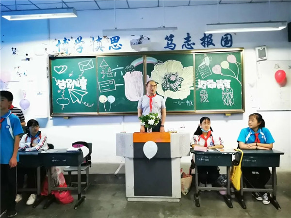 6月1日下午第三节课,七年级同学期盼已久的儿童节庆祝活动开始了。在主会场,庆祝活动由校团委副书记郭文武主持,七一中队的同学为党支部书记、校长王宁波和校团委副书记郭文武佩戴鲜艳的红领巾。出旗后,全体师生同唱队歌……