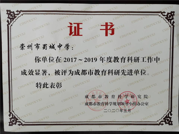 成都市教育科研先进单位获奖证书