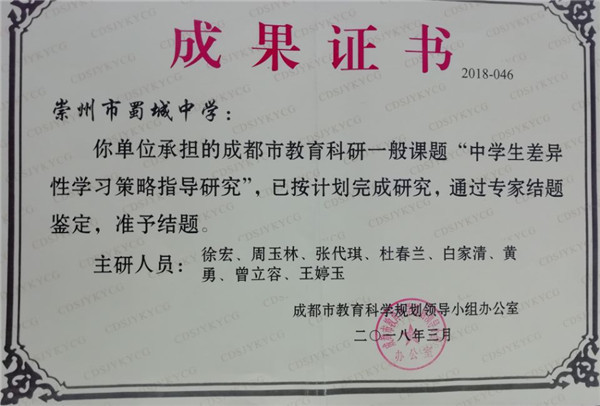 6月12日,在崇州市教育教学研究培训中心组织召开的成都市级课题申报工作座谈会上,崇州市蜀城中学教科室主任张代琪代表学校领取了沉甸甸的荣誉证书——该校在2017-2019年度教育科研工作中成效显著,被评为成都市教育科研先进单位。