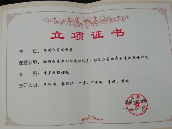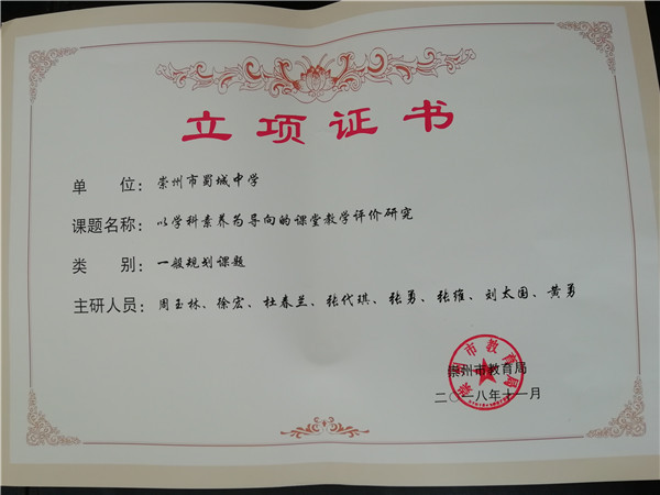 课题研究促学校发展。近年来,学校先后开展了成都市教育科研课题“中学生差异性学习策略的研究”、“普通中学竞技体育后备人才培养模式的实践研究——以崇州市蜀城中学射击射箭特色班为例”、“疫情期间‘停课不停学’在线教学中的互动学习研究”,崇州市教育科研重点课题“体教结合射击射箭特色班育人模式的实践研究”、“三环教学模式的实践研究”、“加强青春期人际交往引导,预防校园欺凌发生的策略研究”,崇州市教育科研一般课题“以学科素养为导向的课堂教学研究”多项科研课题研究。