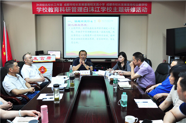 6月18日,邛崃市孙洪初名校长工作室,成都市校长发展基地校文昌小学、白鹤学校,在邛崃市白沫江学校联合开展《学校教育科研管理主题研修活动》。市教育局领导李文杰局长,人事科负责人陈英及“一室两校”领衔人孙洪初、余志鹏、吴仲祥及其成员校长、副校长共27人参加研讨活动。