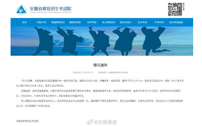 安徽省委、省政府高度重视,主要负责同志在歙县查看灾情和考点情况,调度指挥高考工作。经研究并报教育部,歙县考区原定7月7日语文、数学科目考试延期举行,7月8日综合、外语科目考试正常举行。具体安排将及时通知考生。