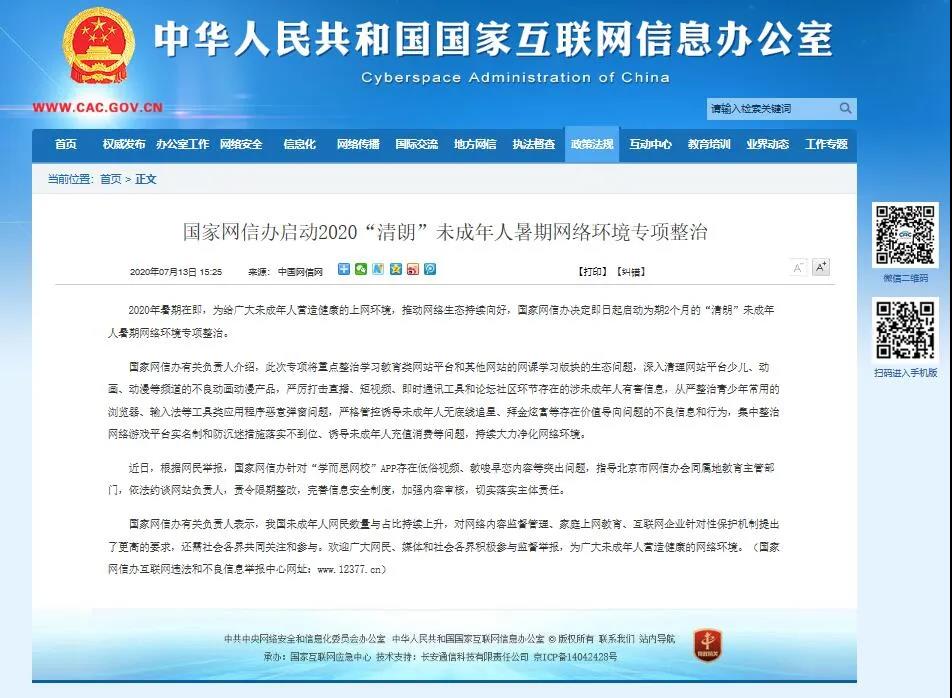 7月13日,国家互联网信息办公室网站发布《关于开展2020“清朗”未成年人暑期网络环境专项整治的通知》。