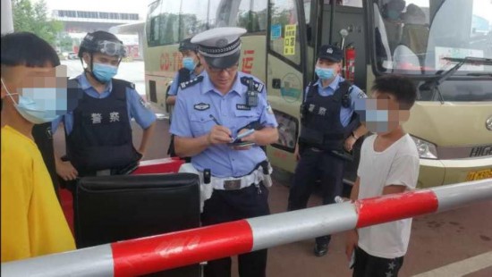 下午14:52分,交警五分局四大队民警在成南高速联合检查站,将这辆大巴车挡下,车上6名未成年小孩也被叫下车。