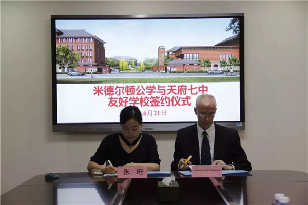 天府七中与英国米德尔顿公学,芬兰塞纳约基市立中学、市立高中,美国康涅狄格州达瑞恩高中的签定友好学校协议
