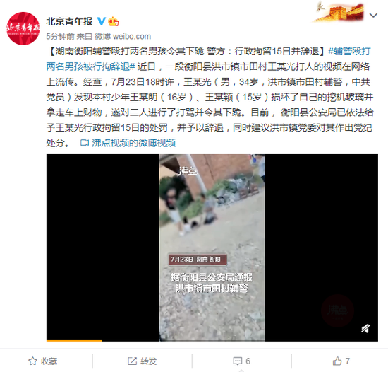 近日,一段衡阳县洪市镇市田村王某光打人的视频在网络上流传。经查,7月23日18时许,王某光(男,34岁,洪市镇市田村辅警,中共党员)发现本村少年王某明(16岁)、王某颖(15岁)损坏了自己的挖机玻璃并拿走车上财物,遂对二人进行了打骂并令其下跪。目前, 衡阳县公安局已依法给予王某光行政拘留15日的处罚,并予以辞退,同时建议洪市镇党委对其作出党纪处分。
