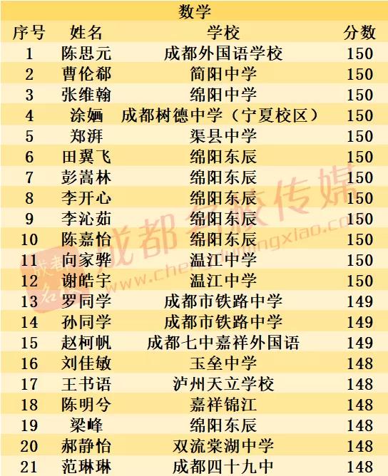 在这12名数学满分学生中,绵阳东辰最多,有整整5位同学!成外占2位,九宁1位,温江中学2位,简阳中学1位,成都的学子共计占了5位,近一半。