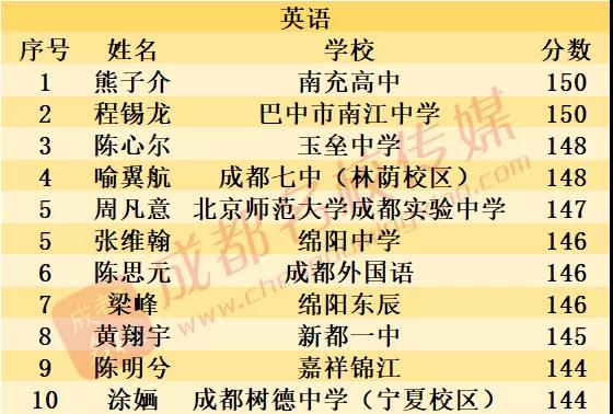 英语惊现2个150分!来自南充高中、巴中市南江中学。