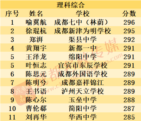 据统计,理综高分学霸的第一位依然是全川理科之星,来自成都七中林荫的喻翼航同学,296分!