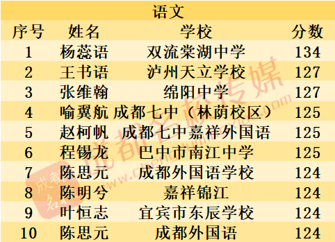 据了解,目前语文单科学霸来自于棠湖中学,为134分!