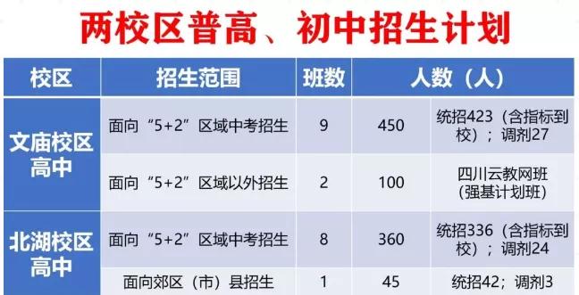 按照去年招生政策,北湖校区面向成都市郊区(市)县招生45人,其中统招生42人,调剂生3人。(郊县统招生:在郊县参加中考,户口地与学校地方一致;郊县调剂生:在郊县参加中考,户口地与学校地方不一致。)