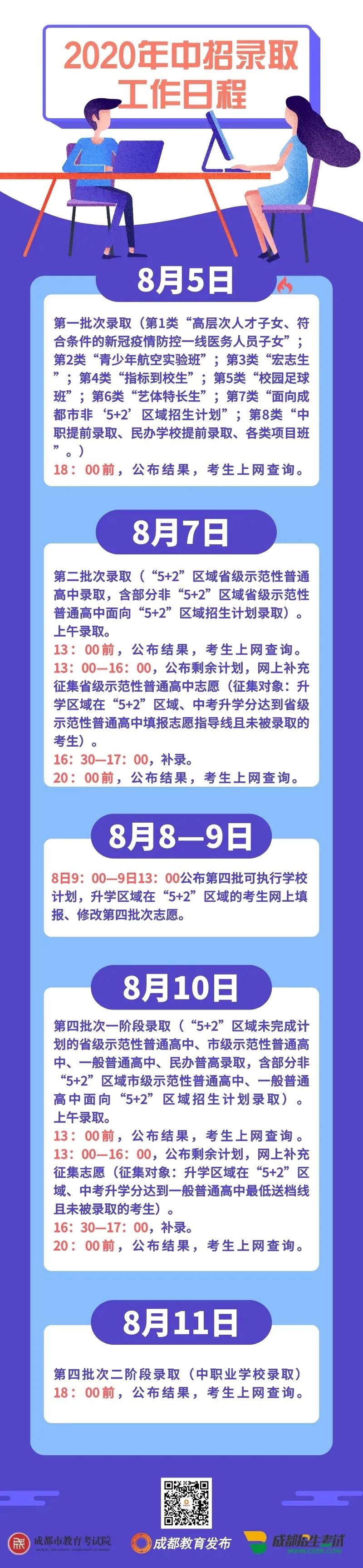 2020年成都市高中阶段教育学校统一招生录取工作从8月5日开始,共分四批,预计于8月11日结束。