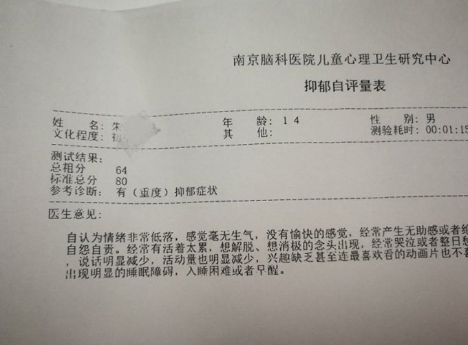 与校园保安发生争执后,朱明毅被诊断患上了抑郁症及应激性精神障碍。 本文图片均由家长提供