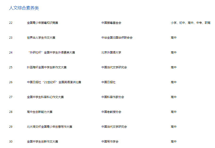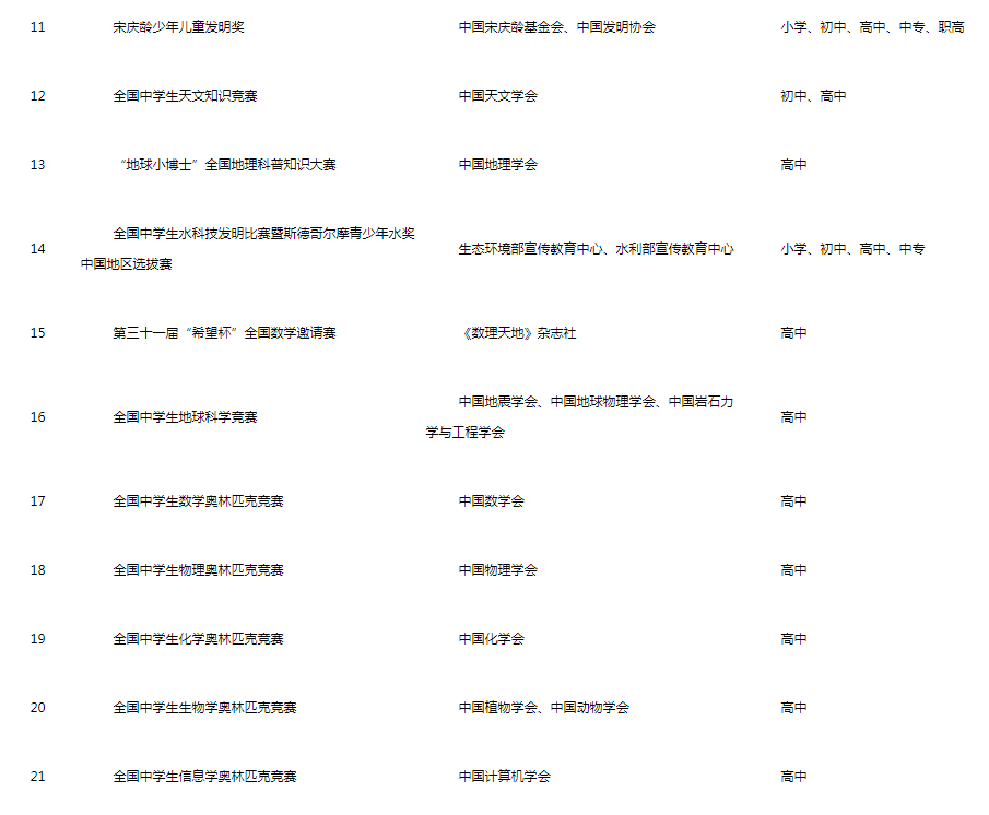 据悉,此次名单是根据《关于面向中小学生的全国性竞赛活动管理办法(试行)》精神,由主办单位自主申报,经教育部组织专家进行评审、公示和复核等程序后最终确定。所有进入名单的竞赛必须坚持公益性,不得以盈利为目的,坚决做到“零收费”。竞赛的举办时间原则上为2021年8月前,人员聚集的竞赛具体举办时,主办单位须报举办地疫情防控部门同意。
