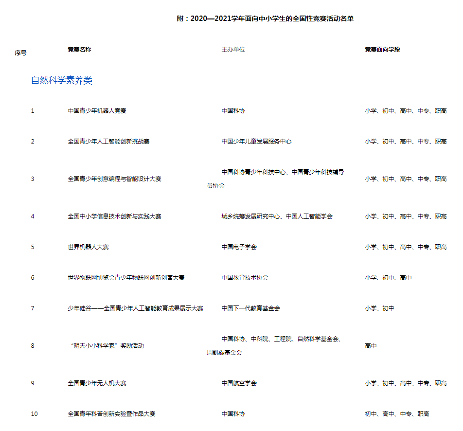 教育部公布2020至2021学年面向中小学生的全国性竞赛活动名单,名单分为“自然科学素养类”“人文综合素养类”“艺术体育类”三类,共有“中国青少年机器人竞赛”等35项竞赛进入名单,其中,全国中学生数学、物理、化学、生物学以及信息学奥林匹克竞赛均入选。