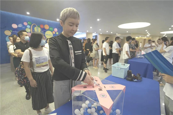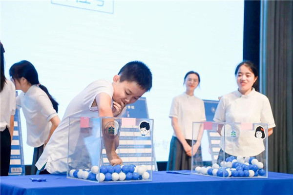 在学生们抽签确认完班级后,班级团队上台依次进行班级团队介绍,并随机抽取班级抽签球,确认自己班级团队所教授的班级,用这种方式决定成为哪个班级的班主任。班主任依次抽取、现场公开了与自己美好的缘分,学生和家长同样以爱与热情初识了孩子的班主任——家长亲自参与、全程亲身目睹,在惊喜、紧张、期盼地心情中,在公平、公正、公开的原则下,用爱和智慧完成了成都天立初中、小学分班仪式。