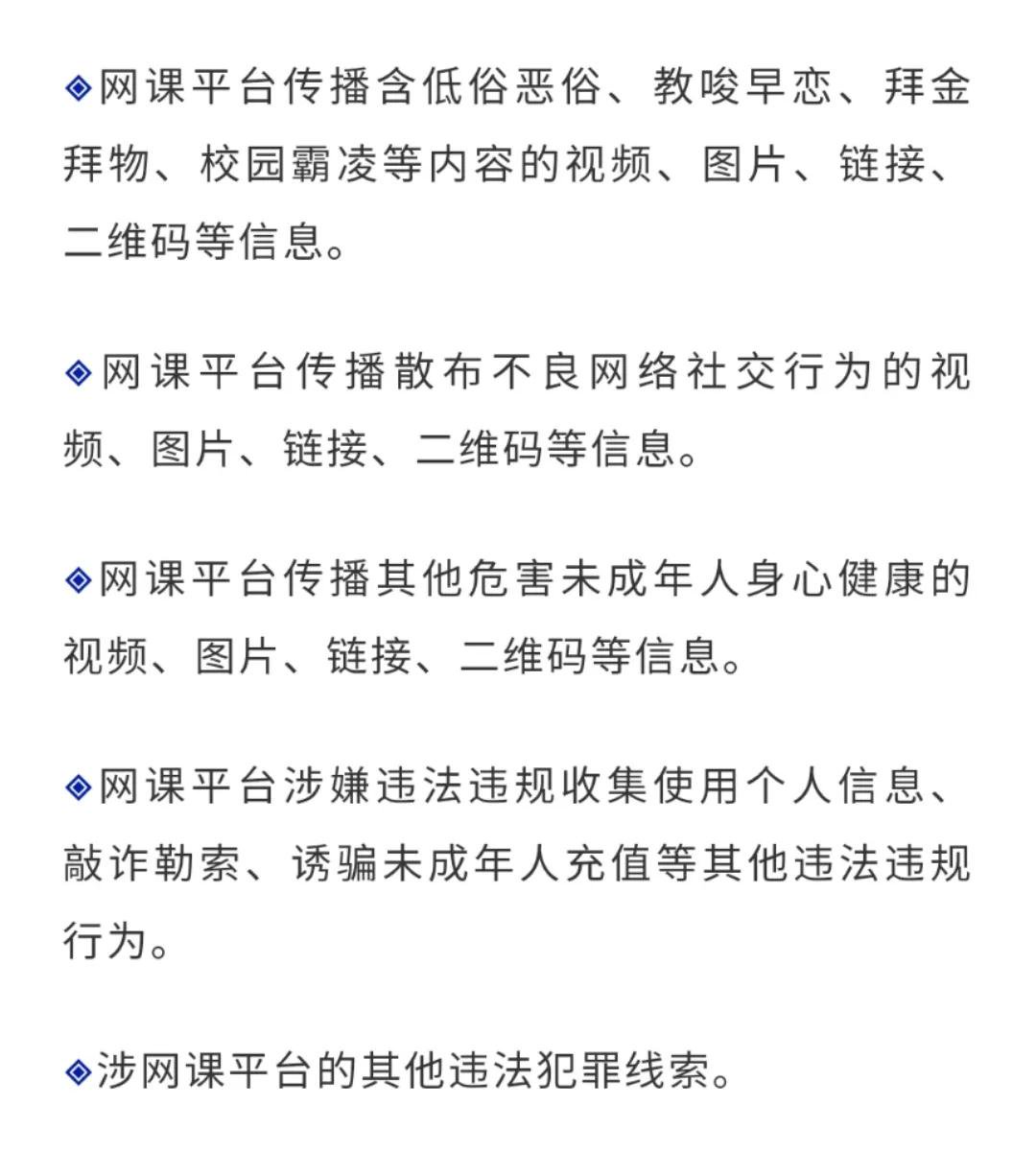 为广泛发现线索,营造良好氛围,公安部网络安全保卫局日前发布通知,请社会各界及广大人民群众及时向公安机关举报中小学生网课平台传播低俗不良及违法有害信息线索。具体情况如下: