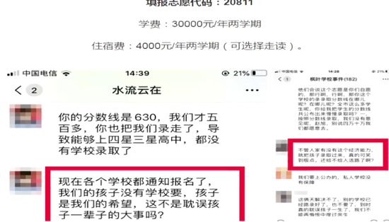 杨女士表示,当时报考时有老师表示,今年第一批次四星级高中的录取分数线应该在630分以上,并建议家长可以在第一批次志愿栏中填报盐城枫叶国际学校,目的是把志愿栏填满,以便顺延至第二批次,被公立普通高中录取。也有家长认为枫叶高中在第一批次,学校应该不差,在不了解该校的情况下选择了报考。但让家长们没有想到的是,本是第一批次的枫叶国际学校最后录取分数仅为528分,不仅比此前公布的最低预估分数低102分,也远远落后于同批次的公办与民办高中,甚至比第二批次普通高中的投档最低分还要低近20分。此外,枫叶国际学校今年是首次招收普通高中生,此前以输送国际生为主,家长质疑其是否具备四星热点高中的师资力量。