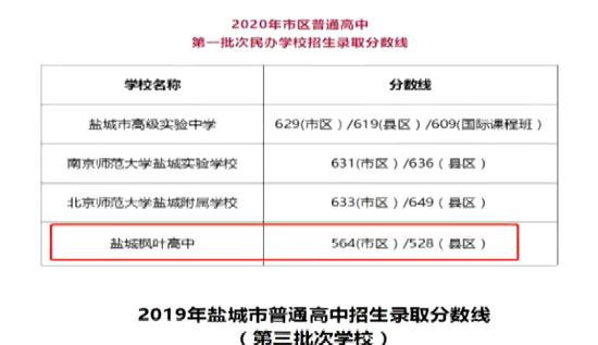 近日,江苏盐城家长杨女士(化名)向记者举报,自己的孩子今年中考考了600多分,虽然无法被盐城中学等当地热点四星级高中录取,但也有望进入排名靠前的学校。不过,在录取信息公布后,录取孩子的并非此前设想的公立高中,而是录取分数线仅为528分的盐城枫叶高中。