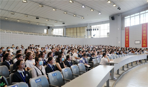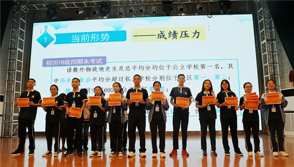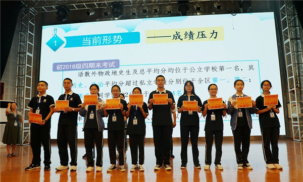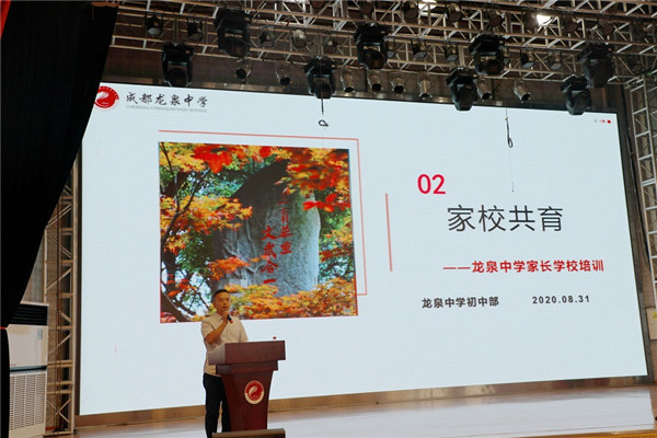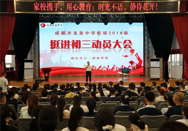 新学年,新征程。为增强初三学子学习动力与信心,家校携手同心助力,成都市龙泉中学初2018级“挺进初三”动员大会于8月31日下午在学校欧鹏报告厅隆重举行。此次动员会由初中部主任廖常竣主持,初2018级全体班主任、学生及家长参加。