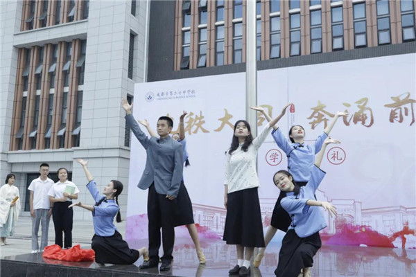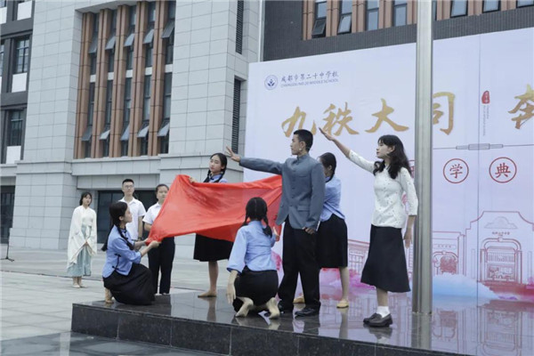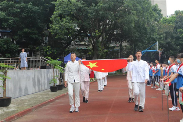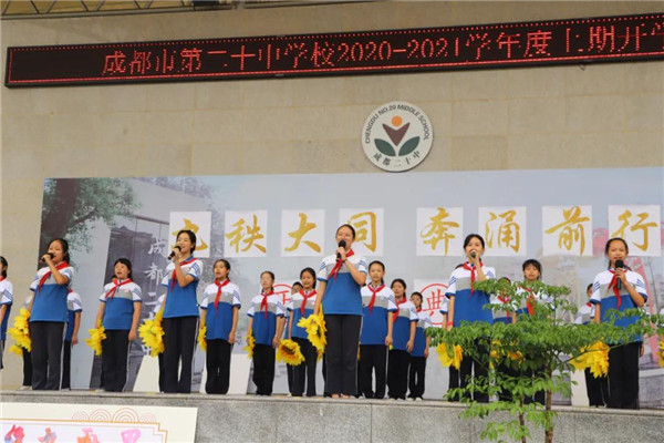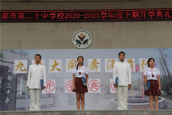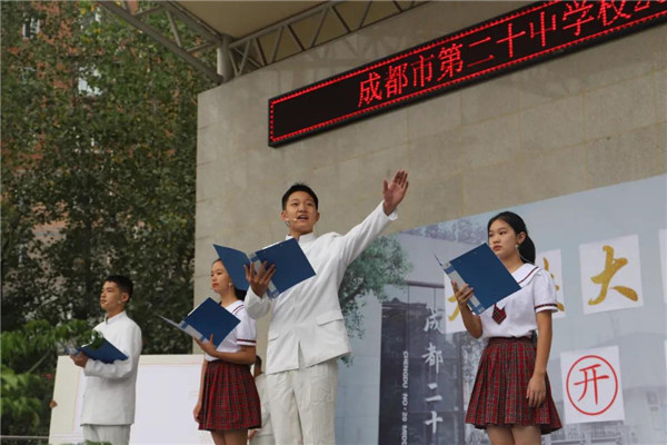 新学期升旗仪式由成都二十中校团委副书记秦梓超老师主持。在鼓乐队的伴奏下,全体师生及家长高唱国歌,注目国旗冉冉升起。