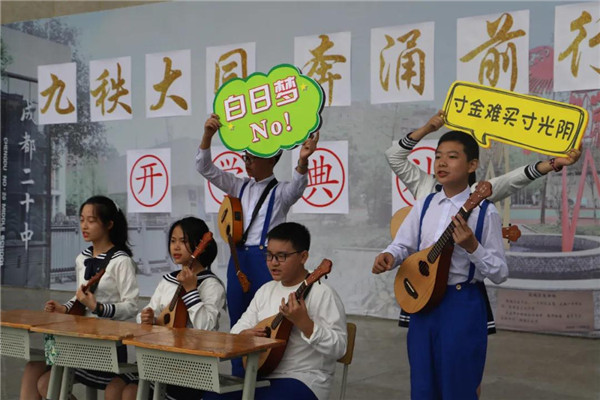 在纪念成都二十中建校90周年这个特别的时刻,该校教师代表黄爱民、谢渊携优秀学生代表李佳兴、赖舒淇、方策一、郑可欣激情朗诵了《大同赋》,带领该校师生回顾历代二十中人奋斗拼搏的历程。