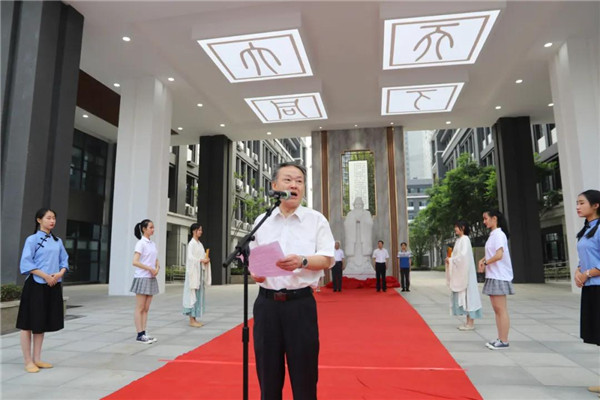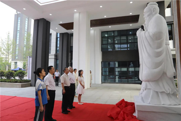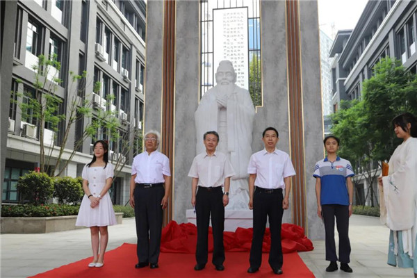 歌赋声中,成都二十中党委书记、校长胡铃冬、退休教师彭嘉祺、化学特级教师黄魏和学生代表徐兆妮、石培新共同为孔子塑像揭幕。