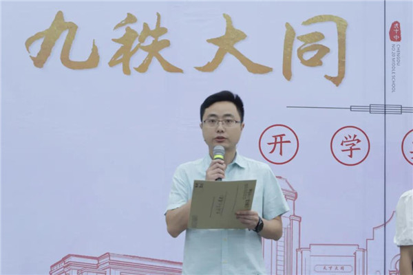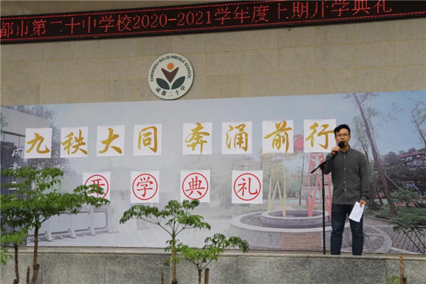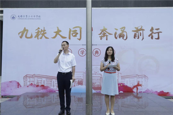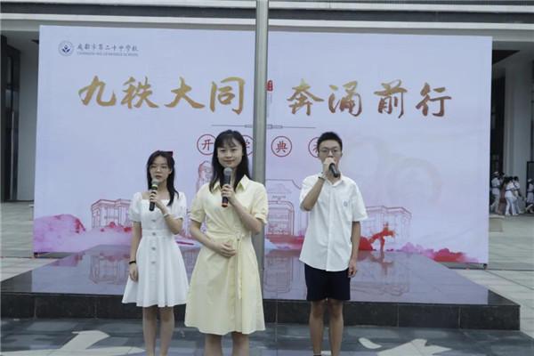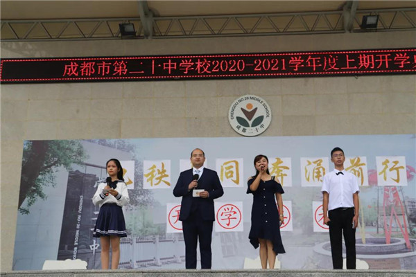 升旗仪式结束后,举行了“九秩大同·奔涌前行”为主题的开学典礼,并以此纪念成都二十中建校90周年。开学典礼由成都市优秀班主任、成都市骨干教师魏玉林,成都市优秀青年教师、全国高中化学教师赛课特等奖获得者王雅敏老师主持。