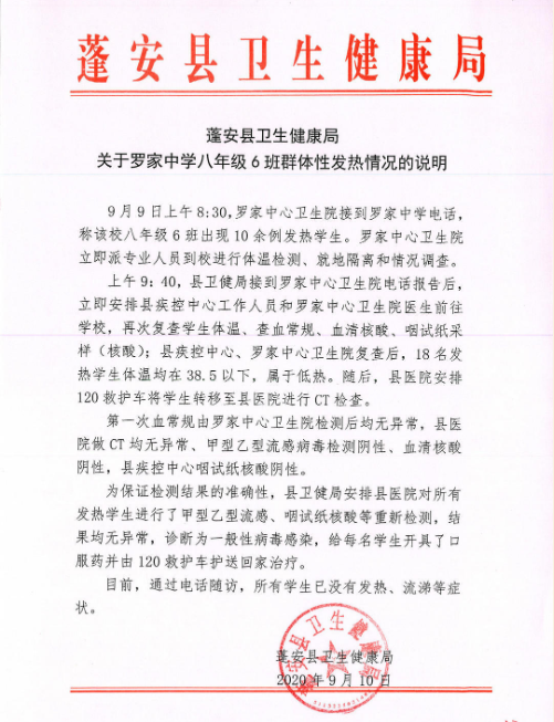 9月10日,蓬安县卫生健康局就“罗家中学八年级6班全体性发热”事件,发布情况说明。说明称,9月9日上午8点30分,罗家中心卫生院接到罗家中学电话,称该校八年级6班出现10余例发热学生。罗家中心卫生院立即派专业人员到校进行体温检测、就地隔离和情况调查。
