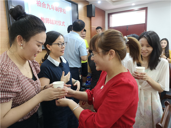 接着,副校长郑云凤宣布本学年师徒结对名单,副书记黄玲英为师傅们颁发了聘书。师傅和徒弟在师徒协议上郑重签字后,徒弟们集体为师傅们献上了一杯茶,师徒们在愉快的氛围中开始交流。