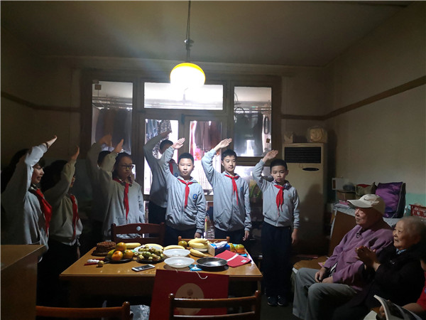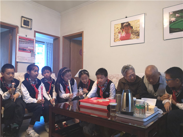 在国庆、中秋到来之际,成都市新华路小学4.1中队和5.1中队部分队员来到家住升平社区的革命前辈苏曹共正爷爷和吕修军爷爷家中,开展慰问活动。