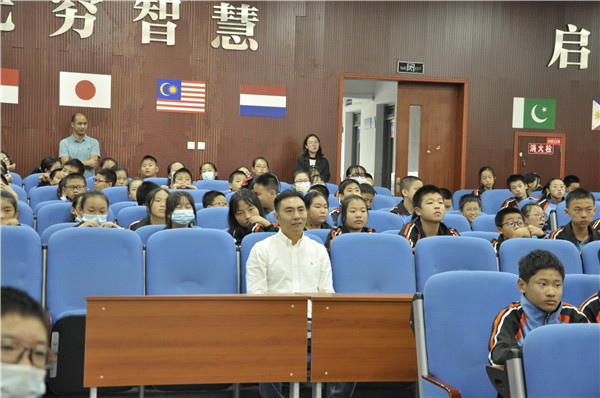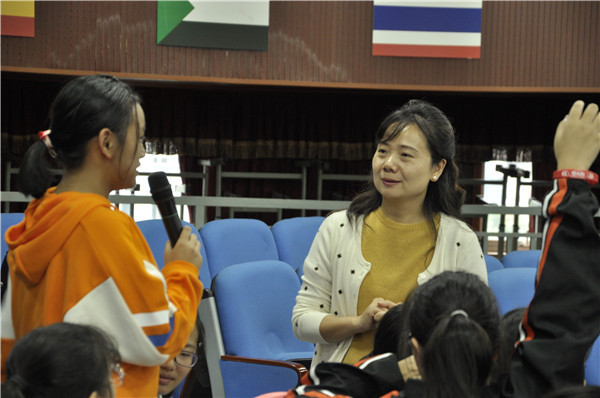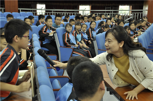 在互动交流环节,当赖校长询问孩子们对成飞中学的印象时,孩子们通过非常精彩的发言讲出了他们的独到感受。一个孩子说道:“我觉得成飞中学很’博’,例如成飞中学的教学楼命名为博学楼、笃学楼、乐学楼等,体现出博大深厚的文化底蕴。”另一个孩子觉得成飞中学很“美”,校园美、老师美、同学美,为学生们营造了良好的学习环境和氛围。
