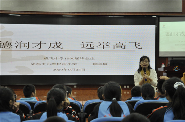 六十载办学历程,六十载薪火传承,2020年,正值成都市成飞中学建校60周年,为了激励广大学生努力学习、励志成才,该校优秀校友、成都市东城根街小学赖晗梅校长应邀参加“荣耀时刻——校友讲坛”主题分享会。