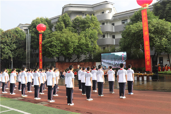 裁判员代表林先波老师和运动员代表陈艳萍同学郑重宣誓后,郑志军校长宣布文翁实验中学第八届运动会正式开幕。
