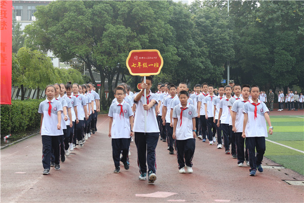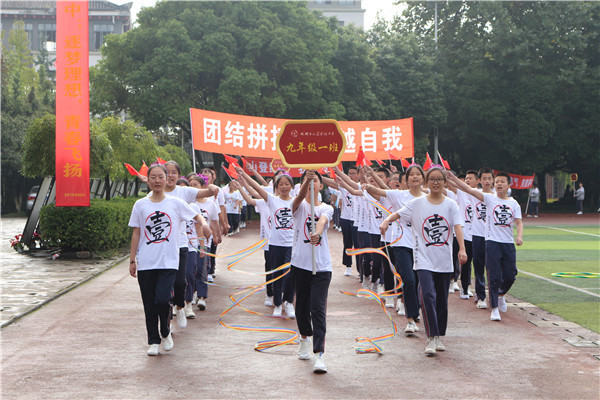 上午8点30分,全体师生齐聚操场。开幕式上,七年级的国防教育成果汇报、八年级的入场式表演、九年级的队列展示,每个年级用他们整齐的队列、嘹亮的口号与运动元素创意十足的班级才艺展示彰显了文中学子们开拓创新、勇往直前的精神风貌。