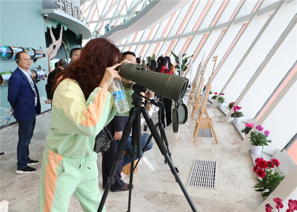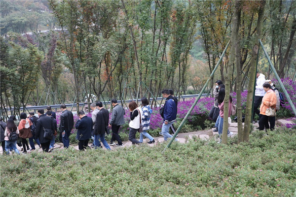 随后,大家沿着景观步道拾级而上,走栈道,登丹景台眺望三岔湖及周围自然景观,远眺建设中的天府机场。